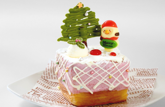 ミルフィーユブレッドの中に、カスタード、いちご、いちごジャムつめ込み、上部にはチョコで作ったサンタやツリーを飾りました。