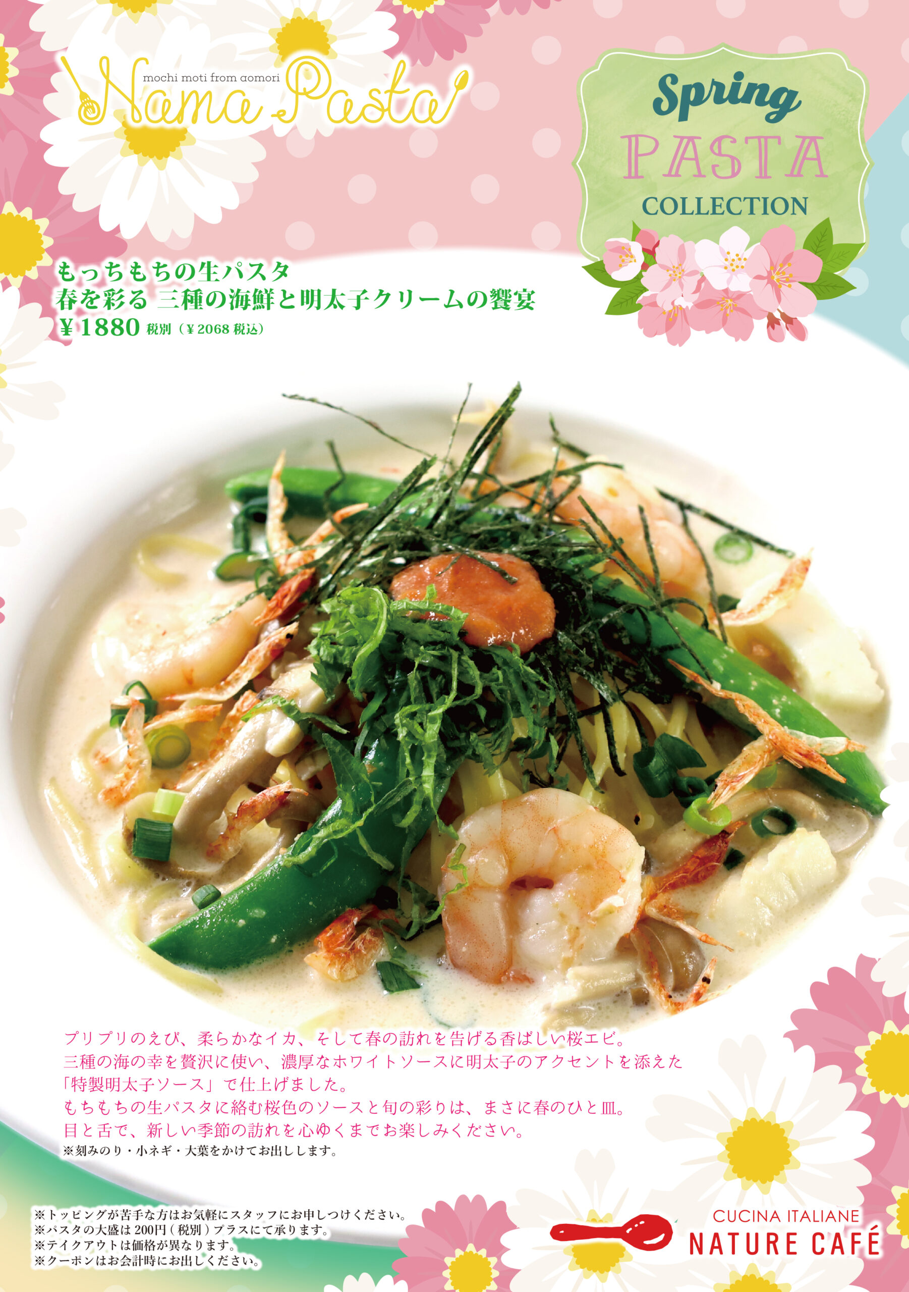 3月の限定もっちもちの生パスタは「春を彩る 三種の海鮮と明太子クリームの饗宴」