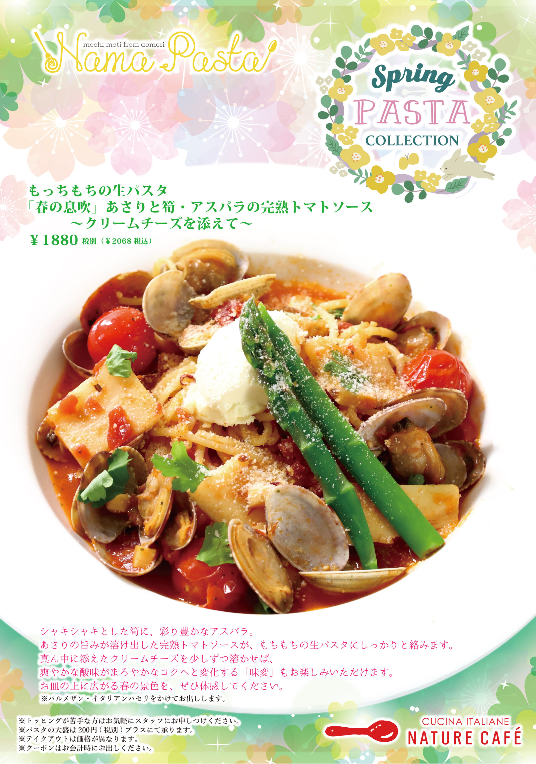 4月の限定もっちもちの生パスタは「春の息吹」あさりと筍・アスパラの完熟トマトソース 〜クリームチーズを添えて〜