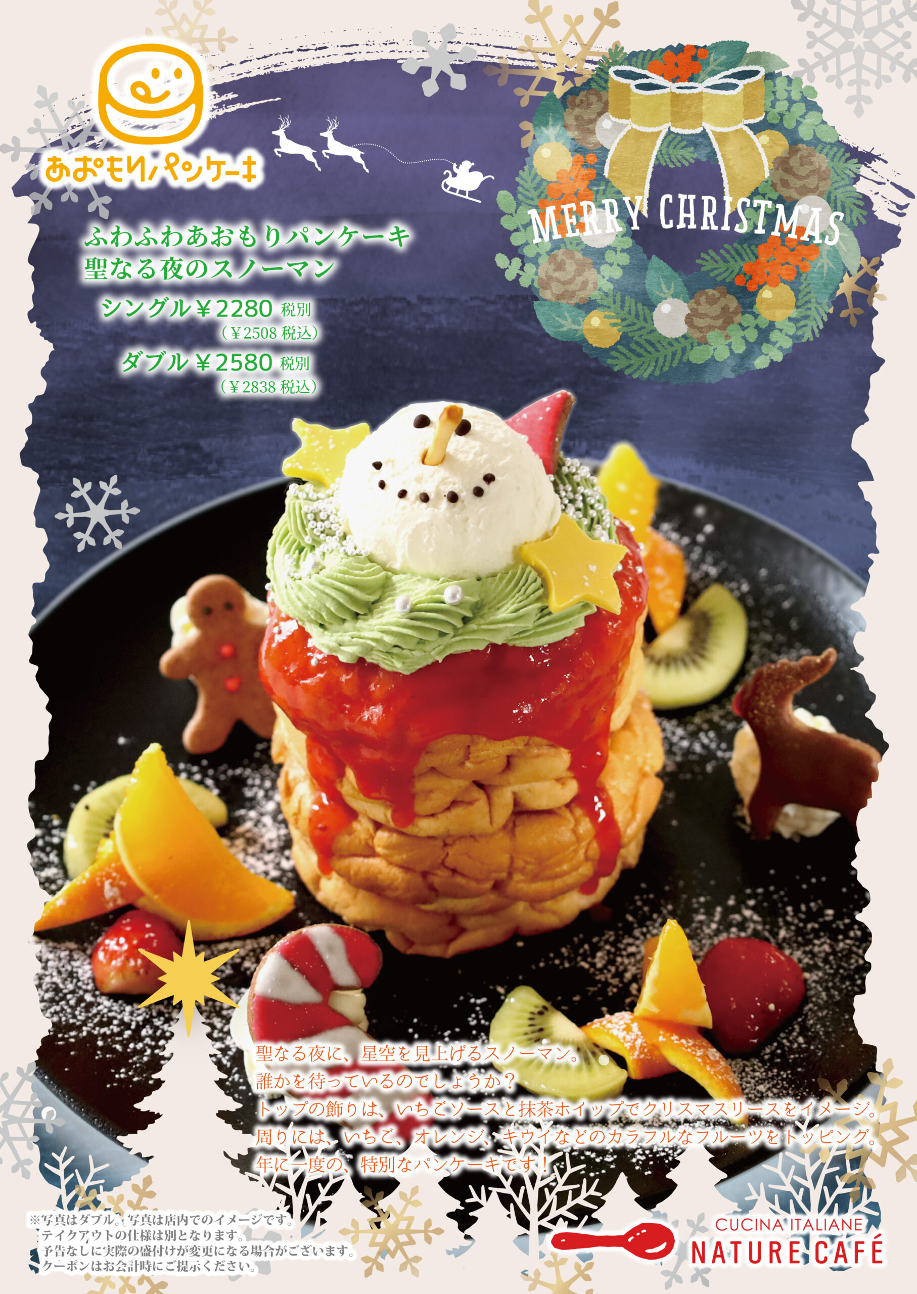 12月の限定パンケーキは「ふわふわあおもりパンケーキ 聖なる夜のスノーマン」
