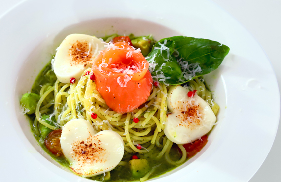 特製ジェノベーゼソースにバラをかたどったスモークサーモンと、ハート型に切り抜いたモッツァレラチーズをトッピング。