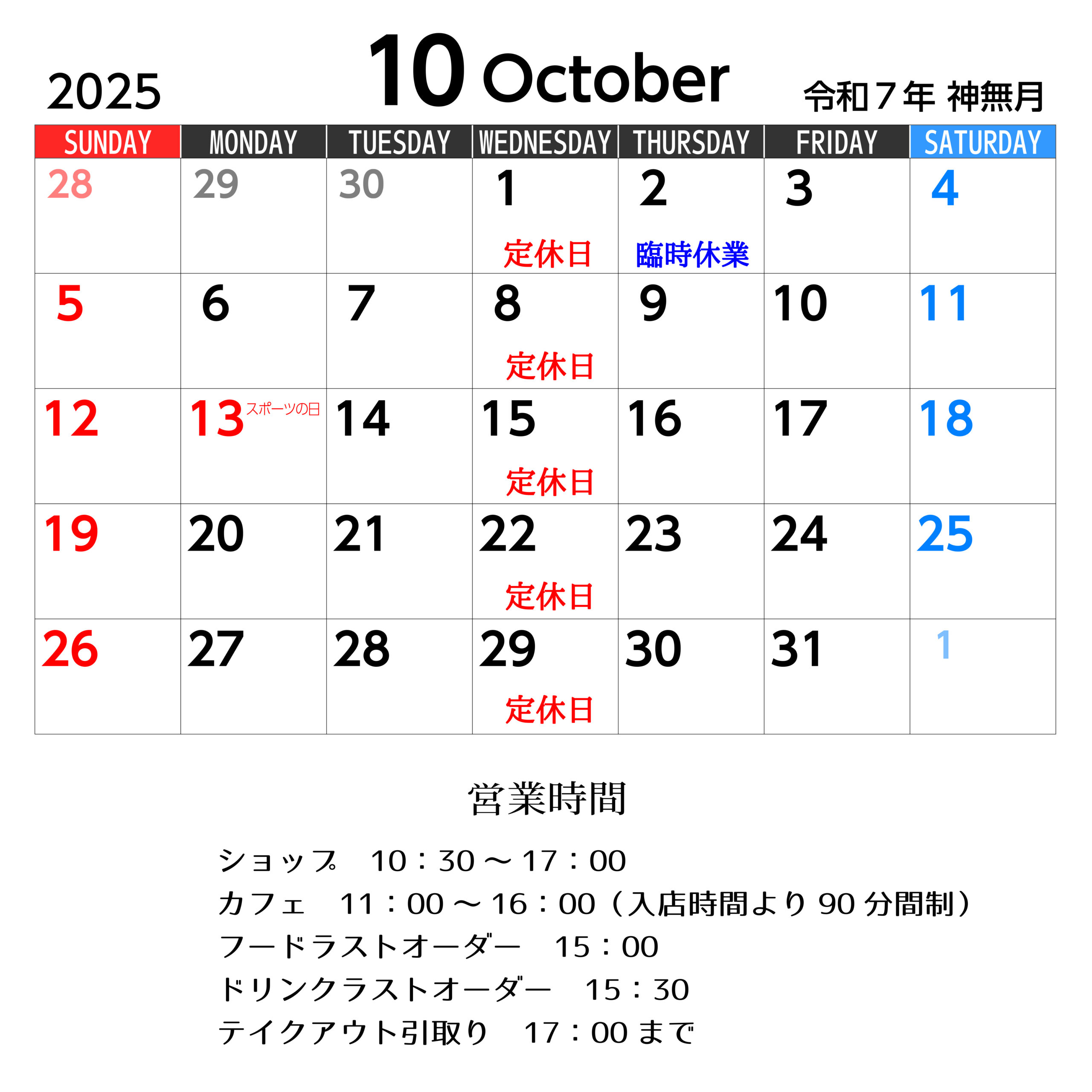 2025年10月営業カレンダー